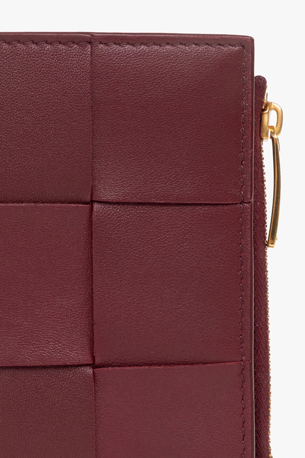 Maroon wallet from Bottega Veneta. Crafted from calf leather and lamb leather with the brand\'s iconic Intreccio weave, this design secures with a snap and features gold-tone metal hardware and one bill compartment, one zip coin pocket, two slip pockets and six card slots inside.