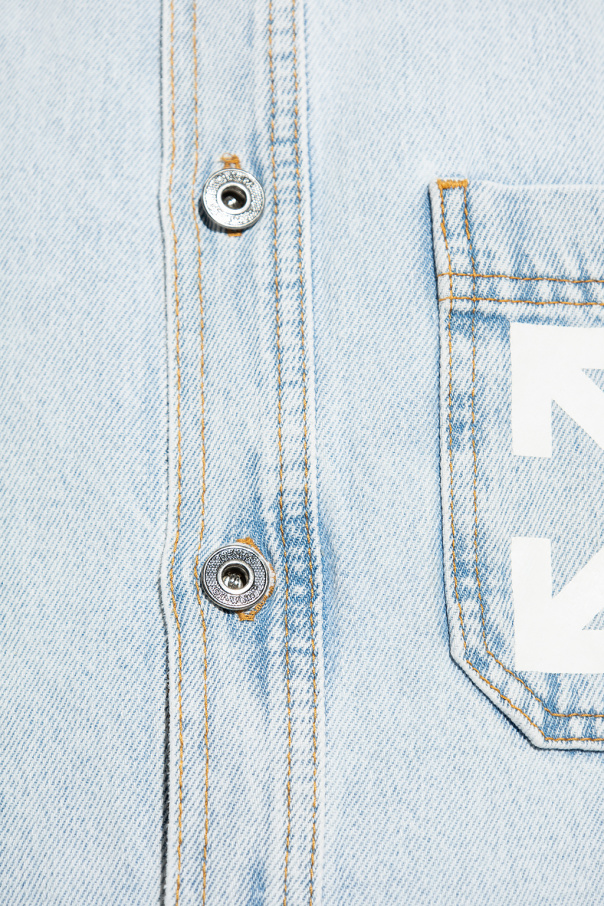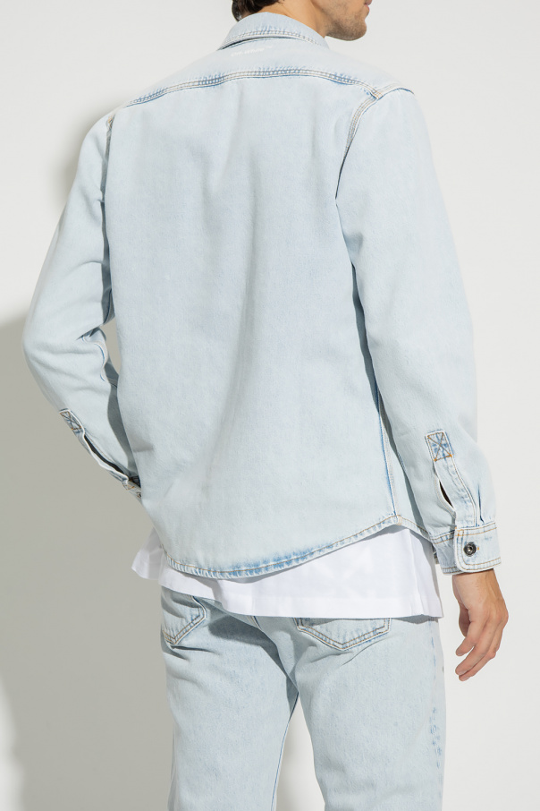 Light blue denim shirt with a collar from Off-White. Inlaid with light brown threads, this garment features metal buttons, front pocket with the white label’s signature arrow motif and long sleeves with buttoned cuffs.
