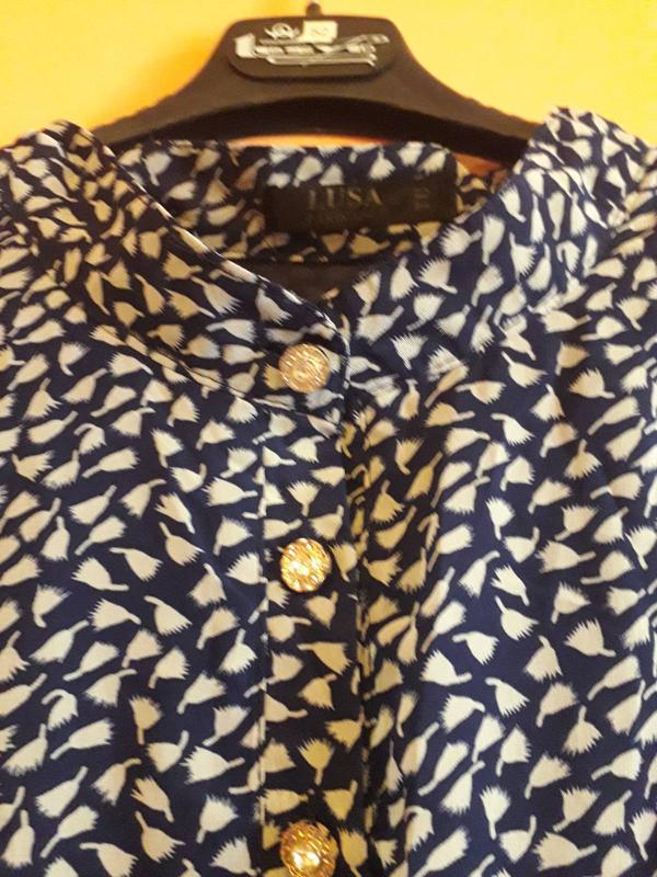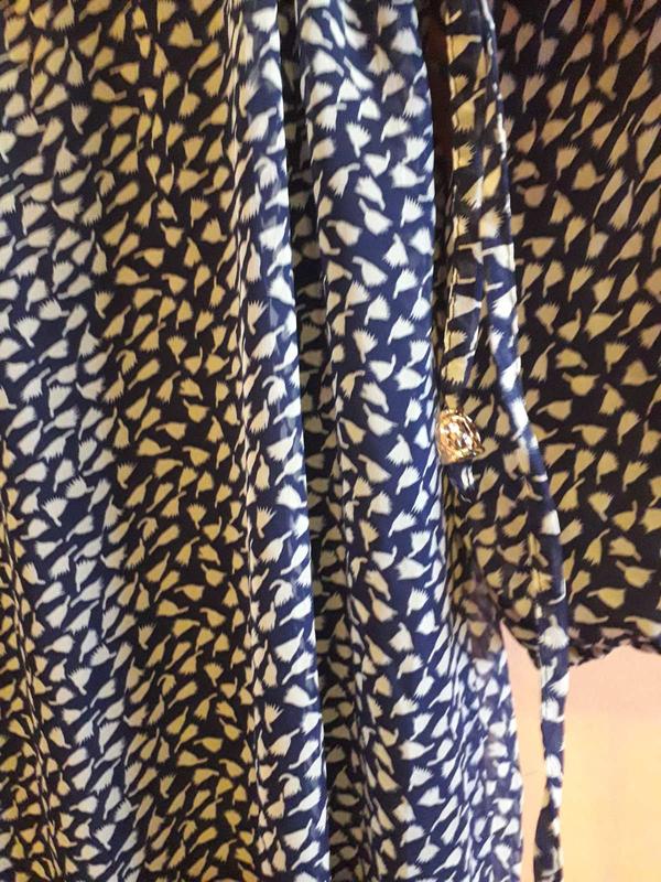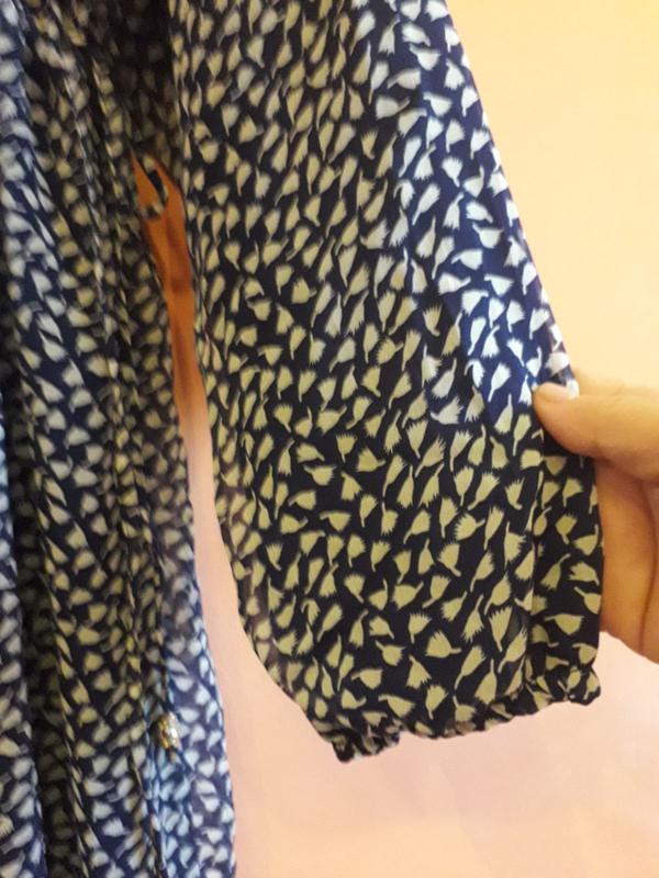платье макси, тёмно синее с беленькими мелкими цветочками, можно как говориться и в мир и в пир,интересная расцветка, хорошее качество ткани, воротник стоечка, впереди не доходя до талии очень красивые пуговички, рукав длинный на резиночке, по талии на таком же тканевом пояске, который стягивается ка кому нужно, состав ткани полиэстер 95% и 5% эластан, на подкладке полностью, даже рукава, ПОГ-69см., длина рукава-64см., длина платья 145см, производство Франция, новое, но без бирки