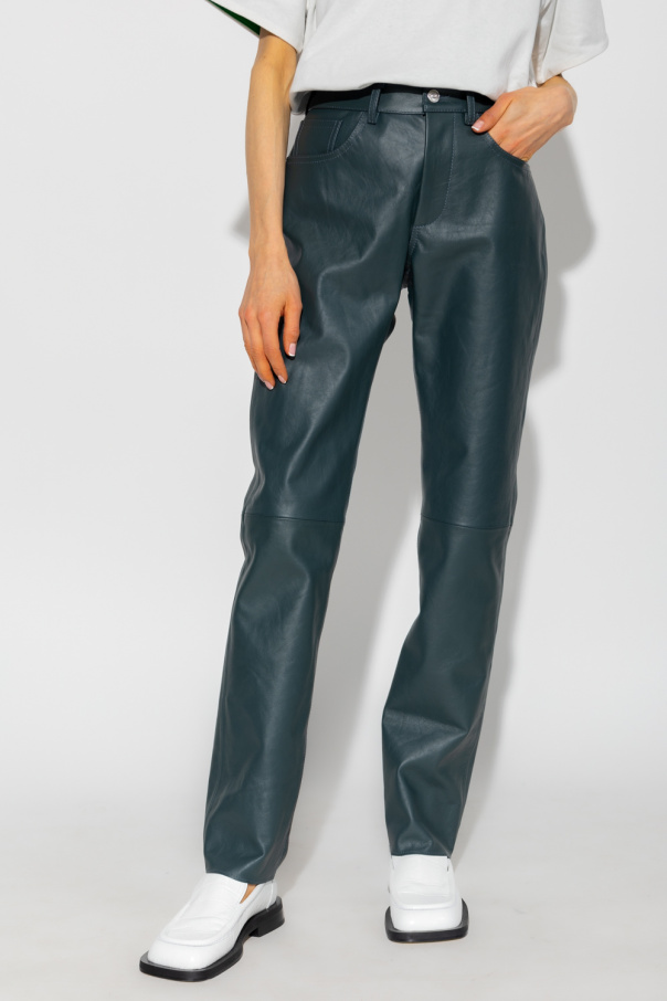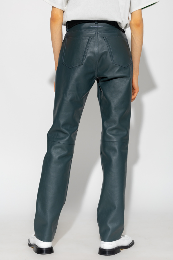 Dark green trousers from MM6 Maison Margiela. Made of calf leather, this pair features a zip and button closure, logo embroidery at the back, five slip pockets and tapered legs.