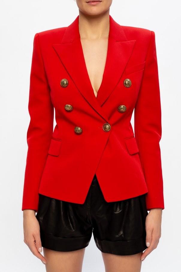 Red blazer with notch lapels from Balmain. Made of wool. Fastened with buttons featuring logo appliques. Slip pocket and two flap pockets on the front.