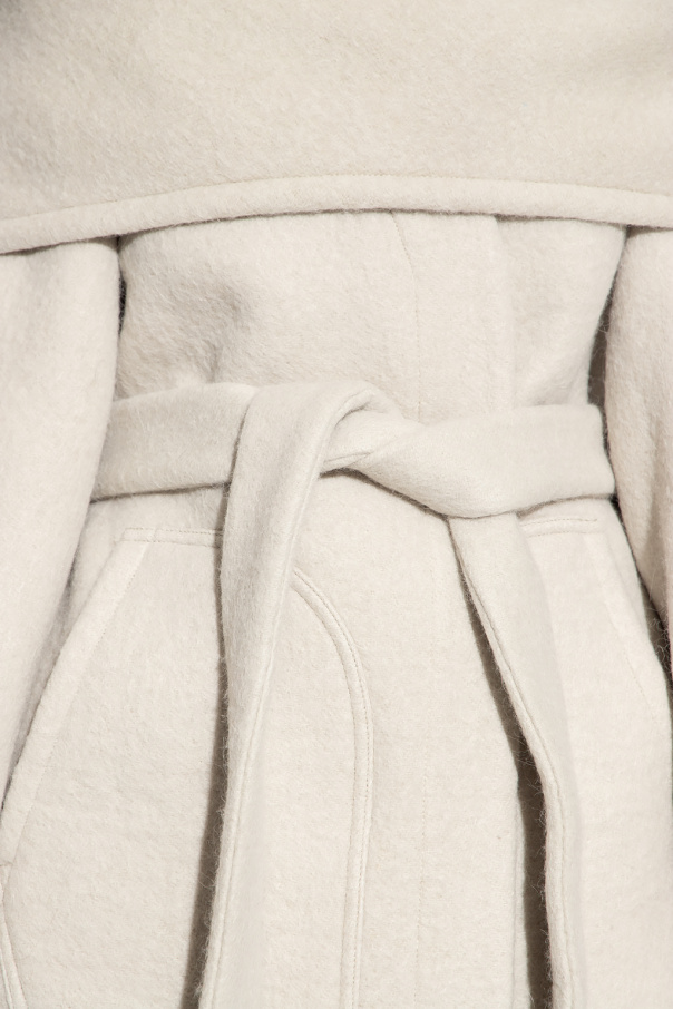 Grey coat from Rick Owens. Made of a wool and alpaca blend, this design features a waist tie, two slip pockets, decorative removable tube scarf and single rear vent.