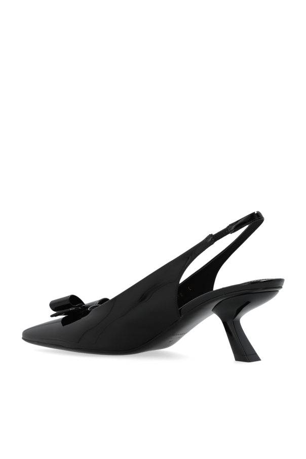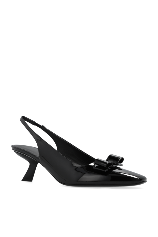 Black ‘Anz’ pumps from FERRAGAMO. Made of patent calf leather with an elongated square toe, this model sits on a black leather sole and features a decorative bow with a logo-engraved plaque on the front, a standard footbed and an open heel.