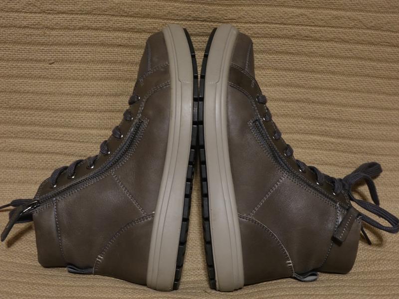 Верх изделия выполнен из мягчайшей гладкой натуральной кожи цвета хаки. В верхеней части задника вшита широкая петля, выполненная из мягкой гладкой натуральной кожи цвета хаки. Для фиксации шнурков предусмотрены 7 пар люверсов, через которые продеваются мягкие широкие плоские шнурки в тон кожи. А на наружной боковой поверхности, вдоль планки для шнурования, вшита действующая фирменная металлическая молния. Все детали изделия отстрочены ровным двойным швом нитками в тон кожи. Язычок очень мягкий, полностью кожаный.