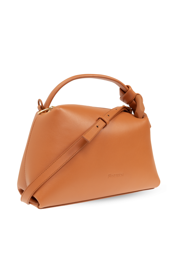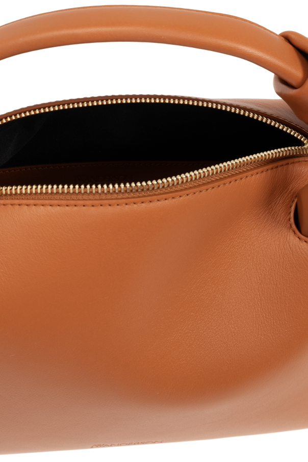 Brown ‘JWA Corner’ shoulder bag from JW Anderson. Made from suede and calf leather, this design fastens via a snap and showcases an embossed logo on the front, one internal compartment with a slip pocket, gold-tone metal hardware as well as a detachable and adjustable shoulder strap and a short handle accentuated with a chain-link appliqué.