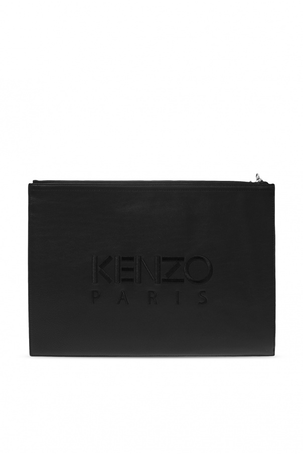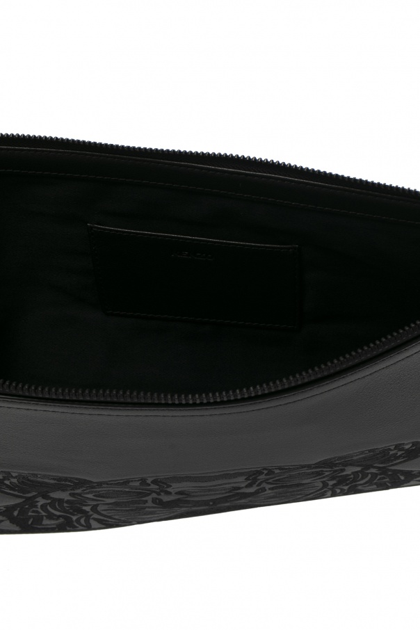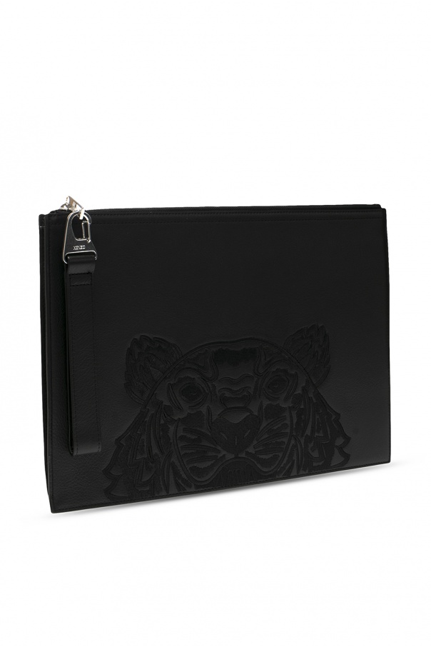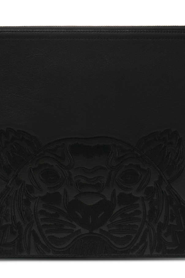 Black clutch from Kenzo. Crafted from leather, this design features zip fastening, an embroidered brand's logo and iconic tiger head as well as wrist strap accentuated with silver-tone lobster clasp and fully lined interior with a card slot.