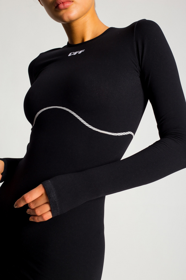Black and white fitted dress from Off-White. This long sleeve design features a round neck and white logo embroideries.