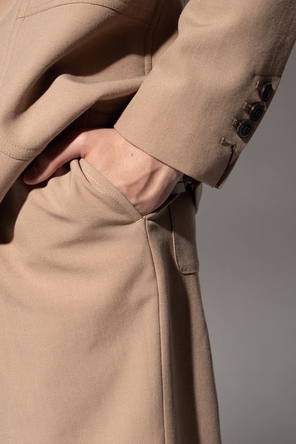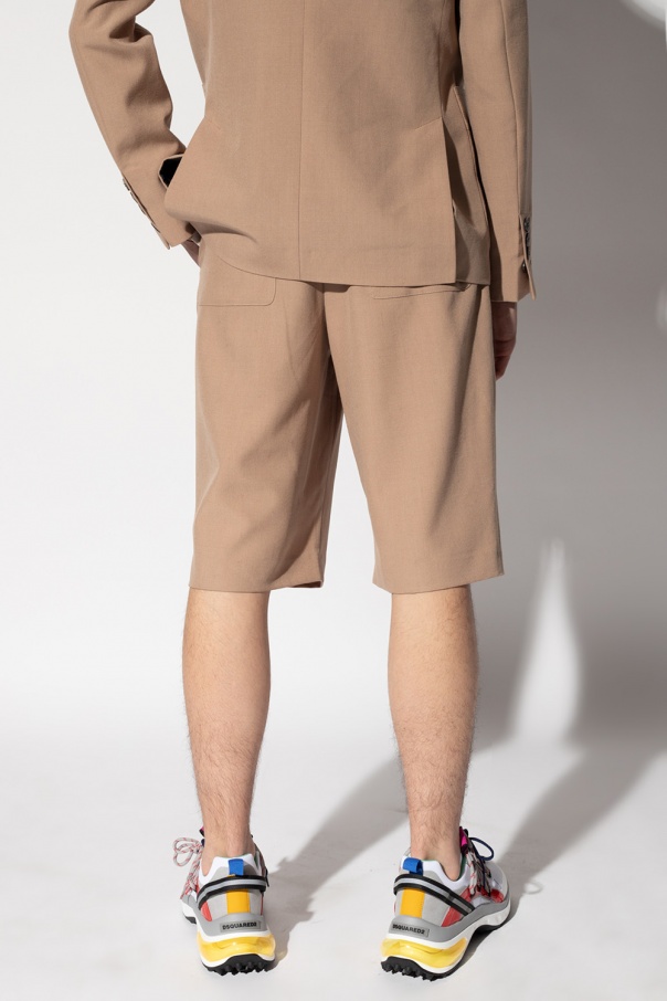 Beige pleat-front shorts from Ami Alexandre Mattiussi. Crafted from wool, this pair falls down with straight legs and features a zip fly, hook and button fastenings, two side seam pockets, two back welt pockets, exposed stitching details and ruched effects.