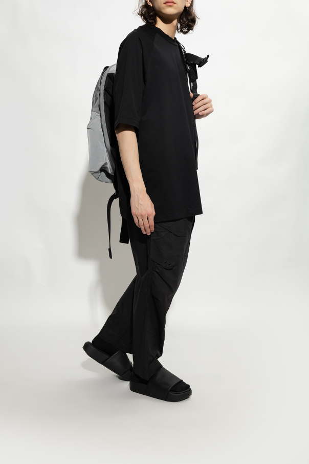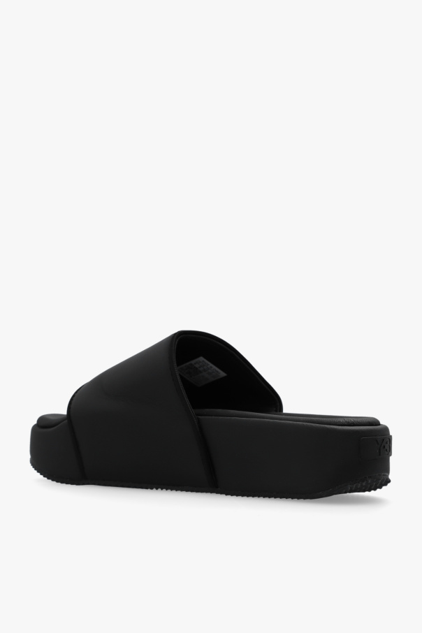 Black platform slides from Y-3 Yohji Yamamoto. Made of leather, this model sits on a black rubber sole and features a logo-embossed application on the back.
