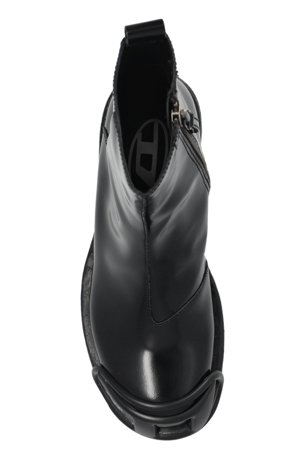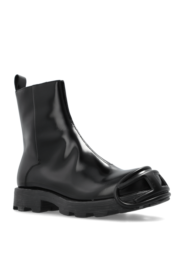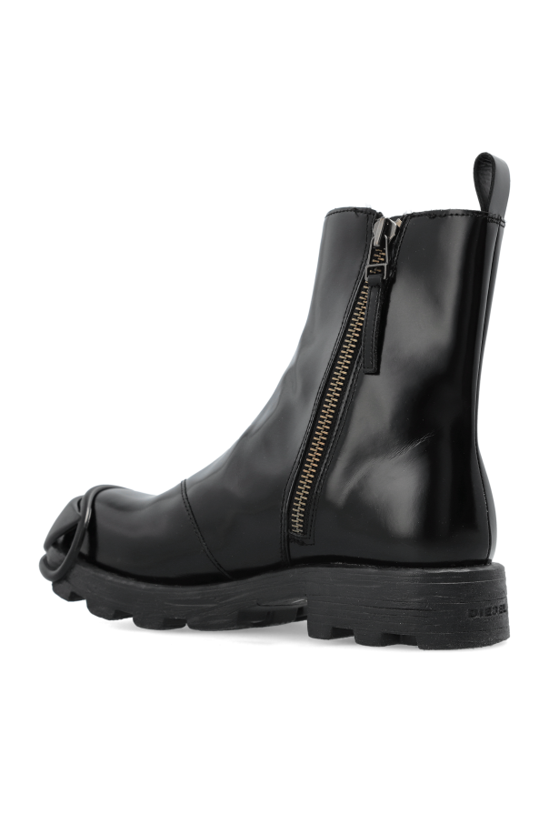 Introducing the D-HAMMER shoes, an epitome of sophistication from Diesel\'s exclusive collection. These men\'s shoes boast a classic, rounded shape with a high shaft, exuding timeless elegance. Crafted from glossy, lacquered leather, they present a sleek, unembellished surface accentuated by striking details. A metal ring detail graces the toe, infusing a modern and unique flair. The side zipper ensures ease of wear. Engineered with a thick, robust sole featuring a pronounced tread, these shoes offer exceptional grip. The discreet brand logo subtly adorns the back of the sole, embodying the understated luxury Diesel is renowned for. Why Choose These Shoes? Exquisite design from an iconic Italian brand. High-quality leather construction. Unique metal detail adds contemporary style. Convenient side zipper for easy wear. Thick sole provides excellent traction.