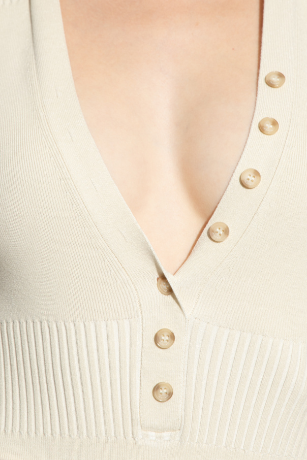 Cream ‘Yauco’ bodysuit from Jacquemus. Crafted from stretchy fabric with ribbed accents, this style features a V-neckline with a collar and button closures, and short sleeves with elastic trims.