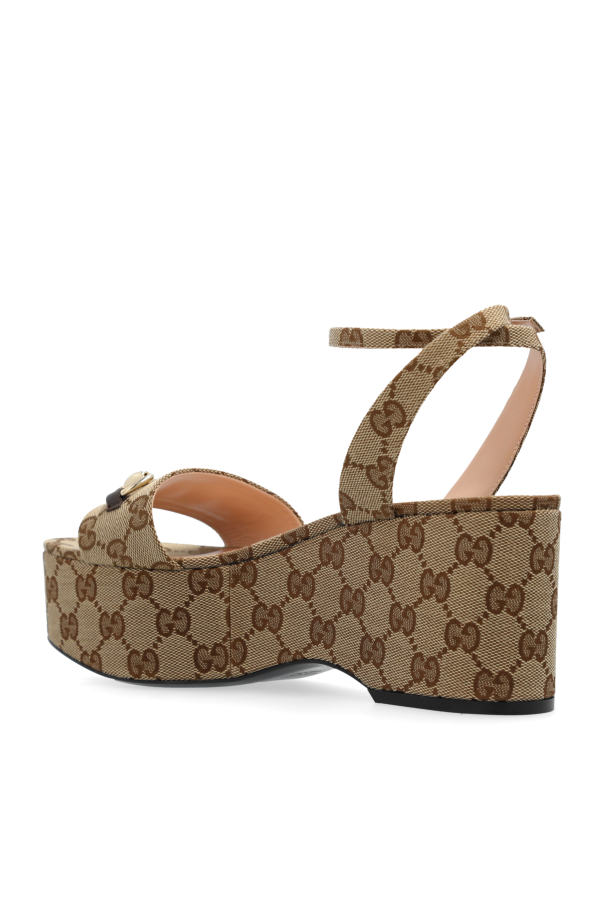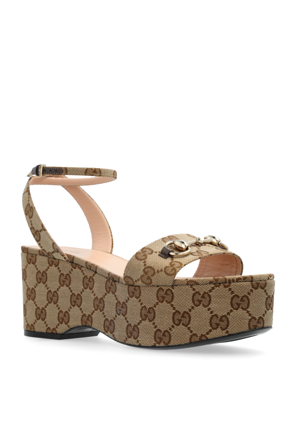 Introducing the exquisite Horsebit Platform Sandals from the exclusive collection by the illustrious designer, Gucci. These sandals epitomize luxurious craftsmanship and contemporary elegance, making them a quintessential addition to any discerning wardrobe. Crafted with an eye for detail, these sandals feature a wide, stable heel platform and an adjustable ankle strap for a secure fit. The open-toe design is accentuated by a broad strap adorned with the iconic GG monogram, meticulously arranged in a sophisticated pattern. The exterior material boasts a harmonious blend of beige and brown hues, while the interior is lined with smooth, light-colored leather, ensuring comfort and durability. A striking gold Horsebit embellishment graces the front strap, adding a touch of opulence, complemented by the golden \"GUCCI\" inscription on the insole. Why purchase this product? Exclusive design with the renowned GG monogram. High-quality craftsmanship with a luxurious leather interior. Stable and comfortable platform heel for all-day wear. Elegant Horsebit detail and golden accents. Adjustable ankle strap for a perfect fit.