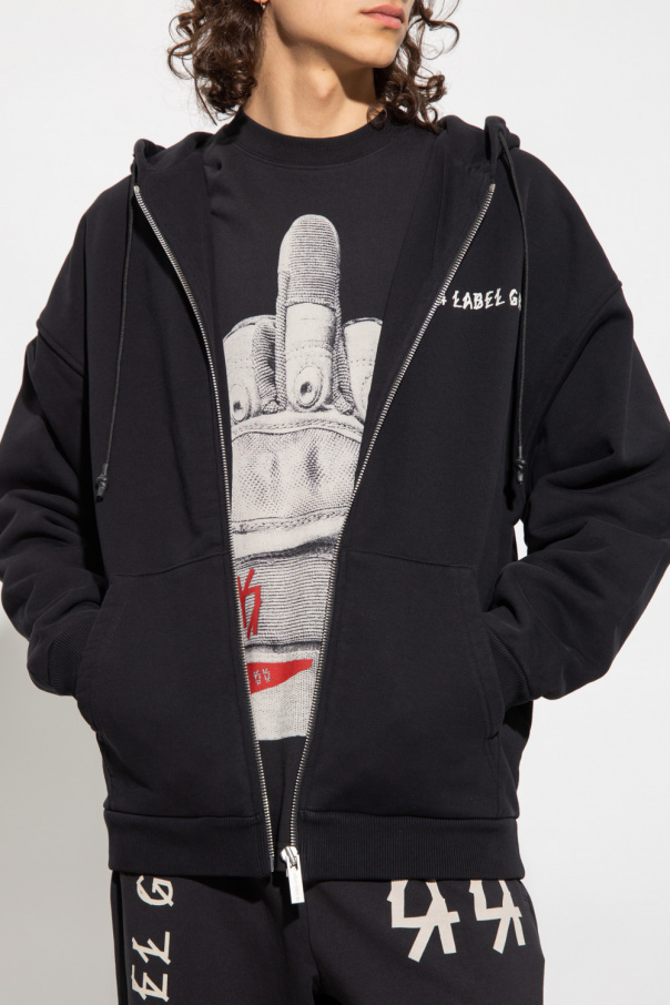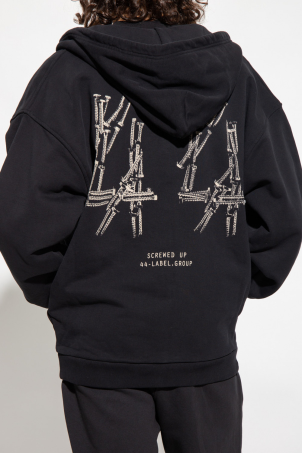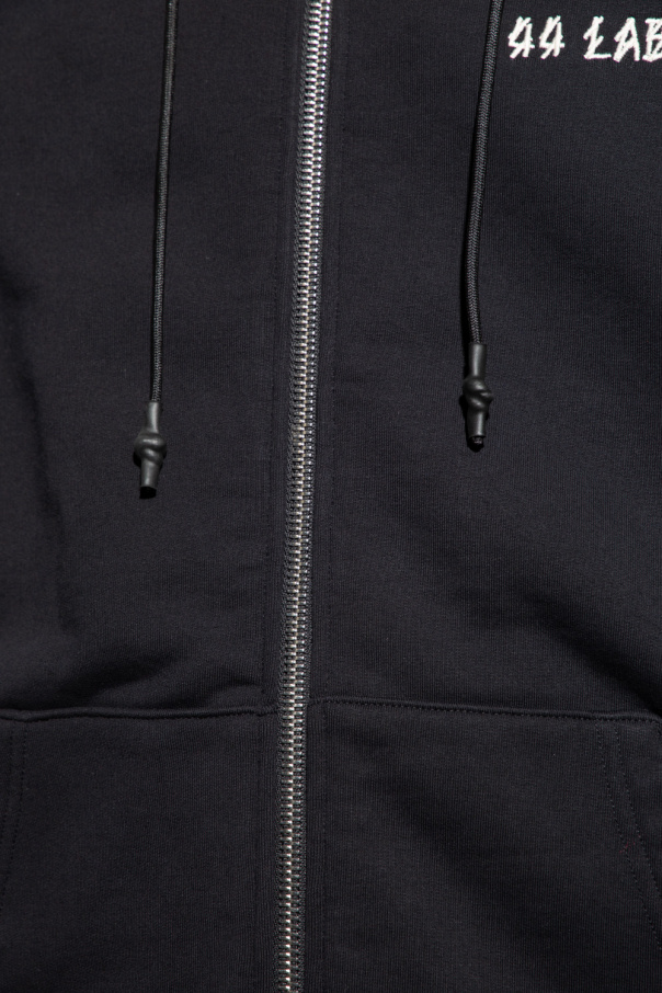 Black hoodie from 44 Label Group. Made of cotton, this garment features a zip fastening, embroidered and printed logo pattern, drawstring hood, two slip pockets and ribbed trims at the hem and cuffs.