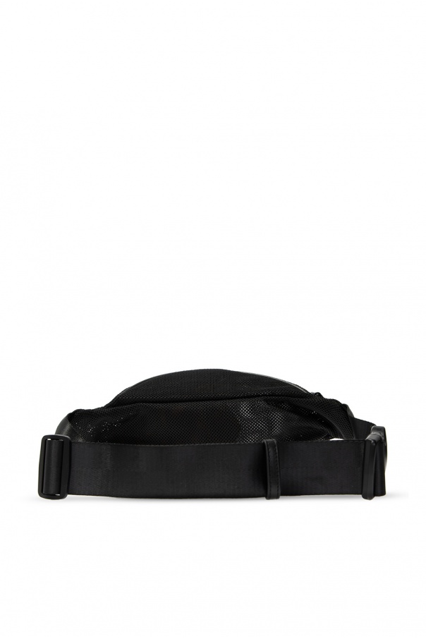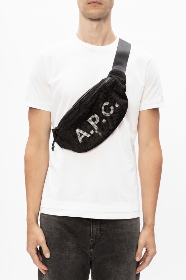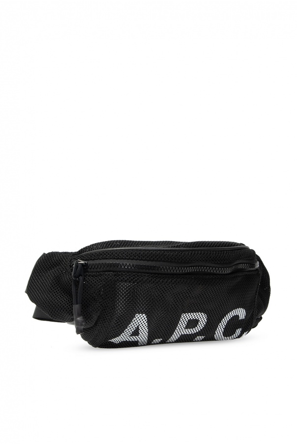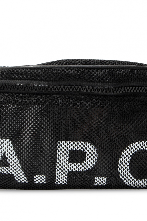 Black ‘Rebound’ belt bag from A.P.C. Crafted in nylon mesh, this accessory fastens via zip and displays large white logo print across the front. Featuring an adjustable strap with buckle closure it has interior with one compartment.
