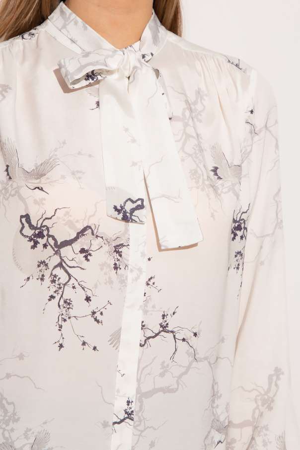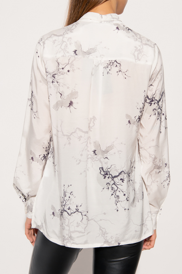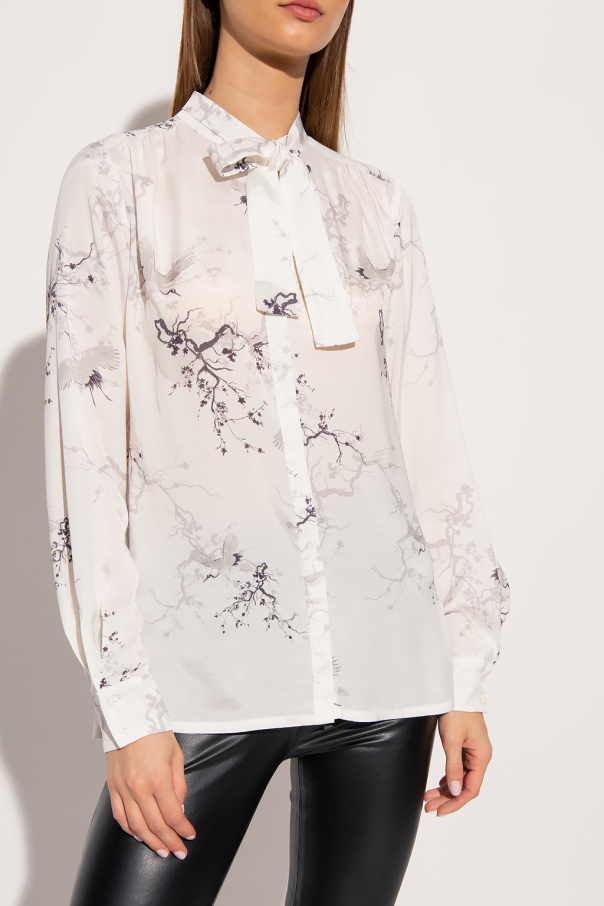 White ‘Toni’ shirt from AllSaints. Enriched by an animal motif, this style features button fastenings and long sleeves with button cuffs.