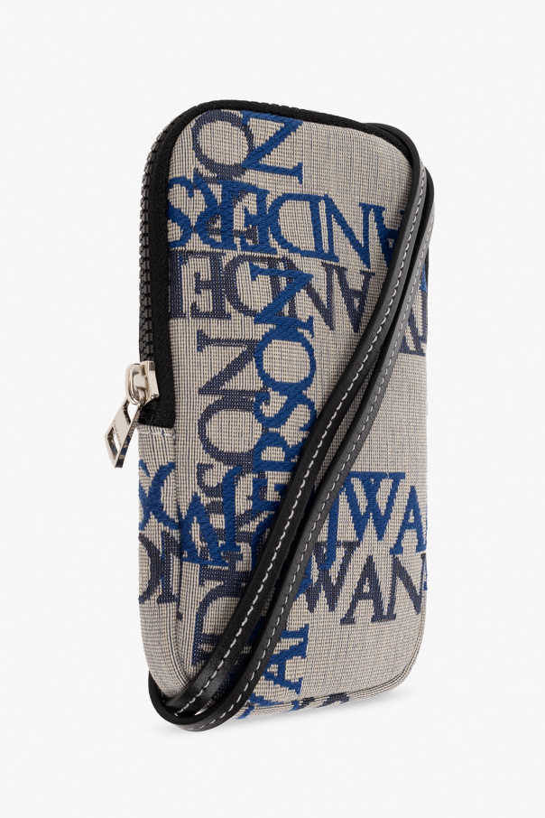 Grey, blue and black phone holder from JW Anderson. Crafted from organic cotton and fastened with a zipper, this item features a logo pattern, a detachable shoulder strap, silver-tone metal hardware and one internal compartment with two slip pockets.