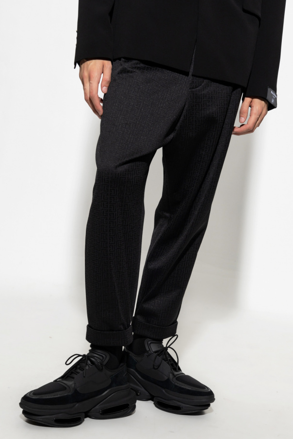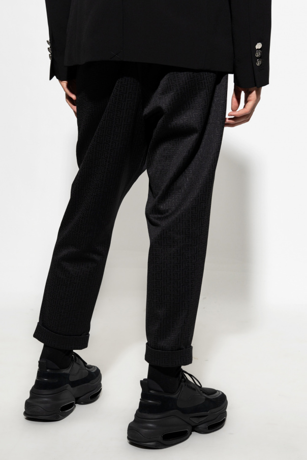 Black trousers from Balmain. Embellished with a logo pattern, this pair features a drawstring waistband, two slip pockets, two button pockets and turn-up cuffs.