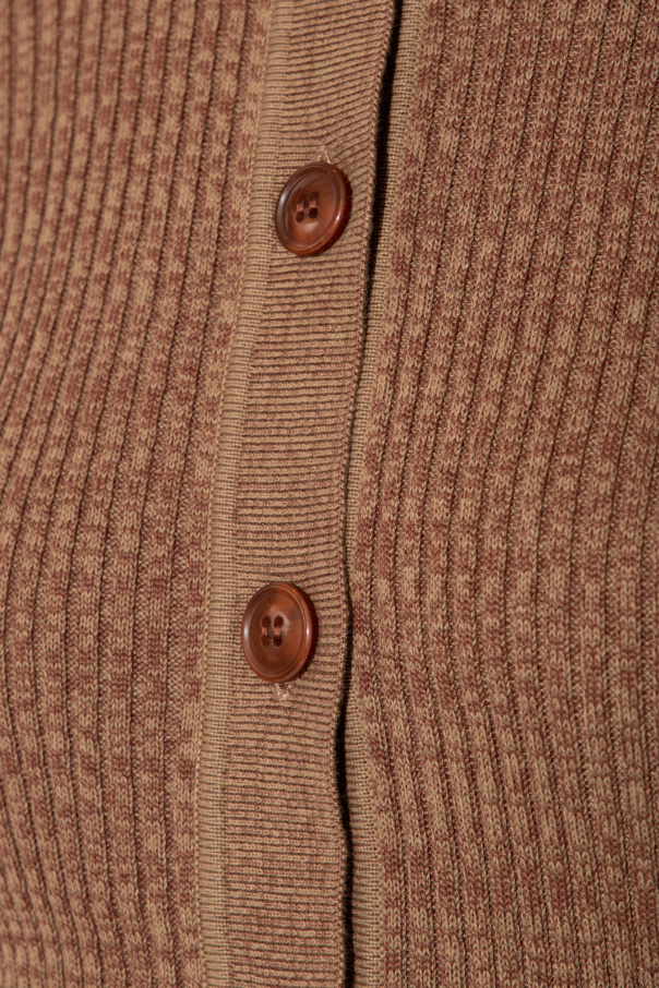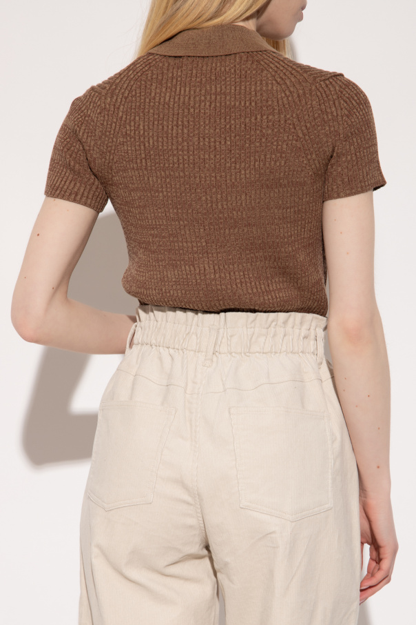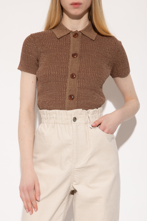 Brown ‘Bonnie’ polo shirt from Samsoe Samsoe. Crafted from a ribbed knit, this style features decorative button closures and short sleeves.