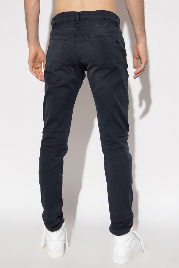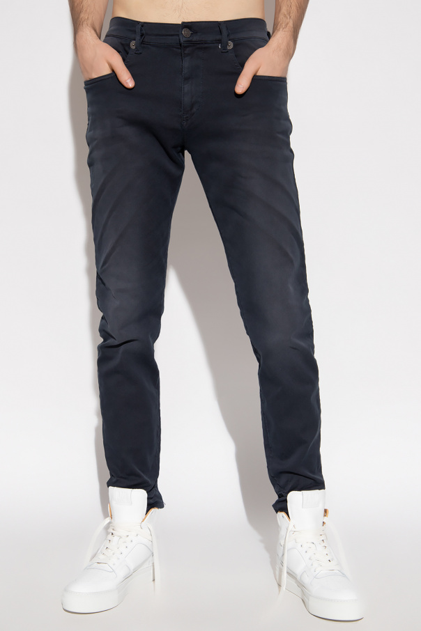 Dark blueish grey ‘D-Strukt Jogg’ trousers from Diesel. Crafted from Track Denim Joggjeans®, this pair falls with slightly tapered legs and features a zip fly with a button, classic five pockets, a patch on the front and logo embroidery at the back.