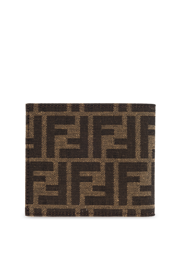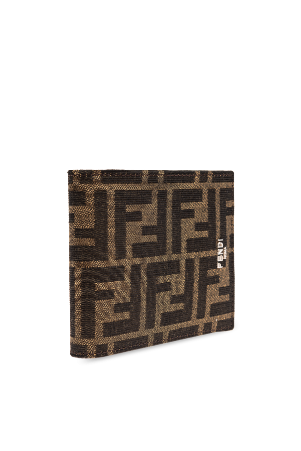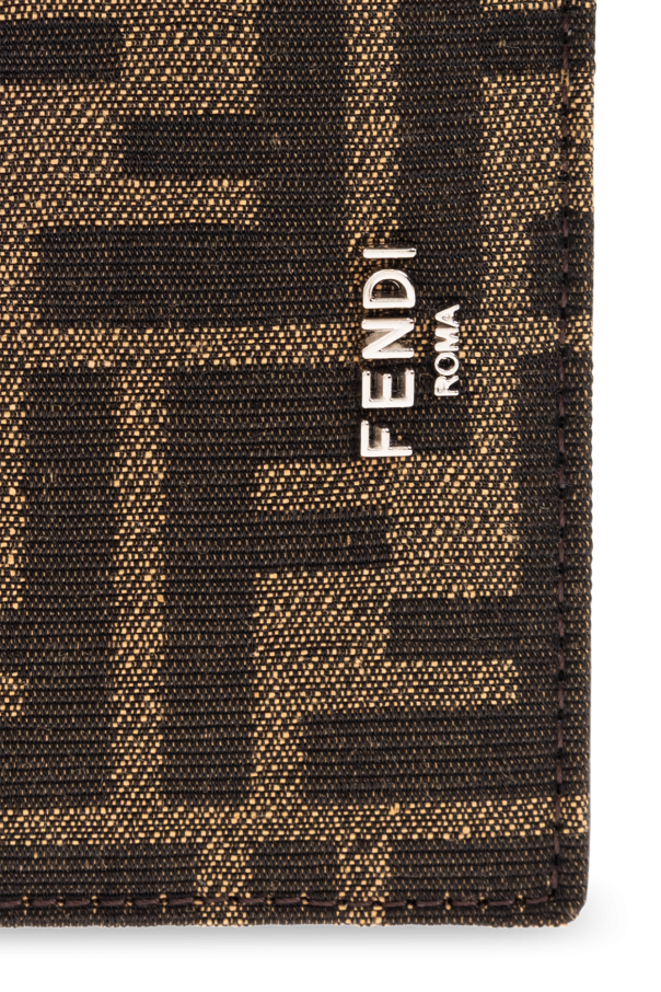 Brown folding wallet from Fendi. Made of monogrammed canvas and trimmed with black calf leather, this design showcases a metal logo plaque as well as two bill compartments, two slip pockets and eight card slots inside.