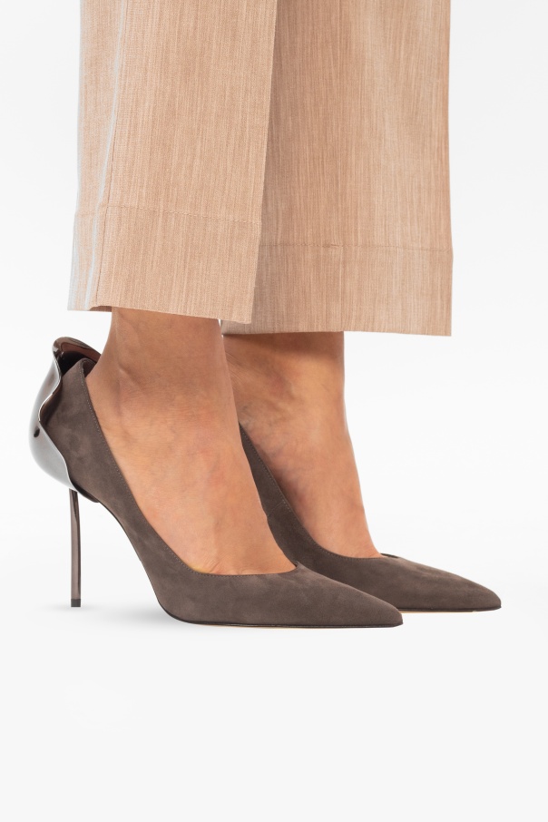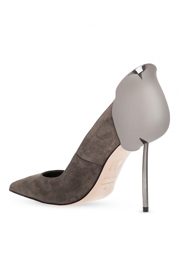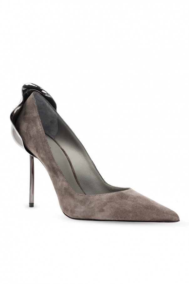 Grey ‘Petalo’ stiletto pumps from Le Silla. Embellished with a silver-tone metal application, this suede-crafted pair features pointed toe and beige leather sole hardened with rubber insert.