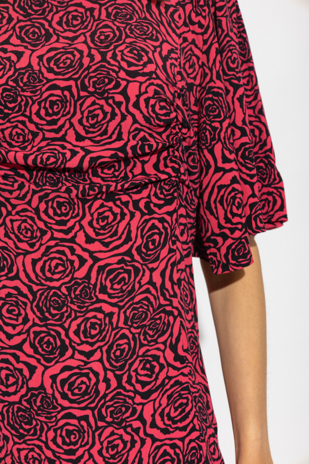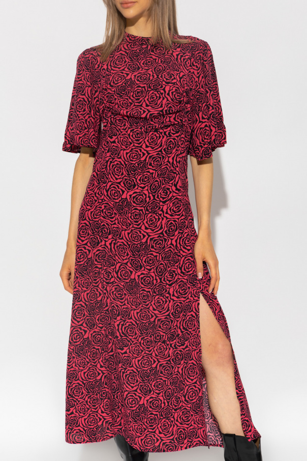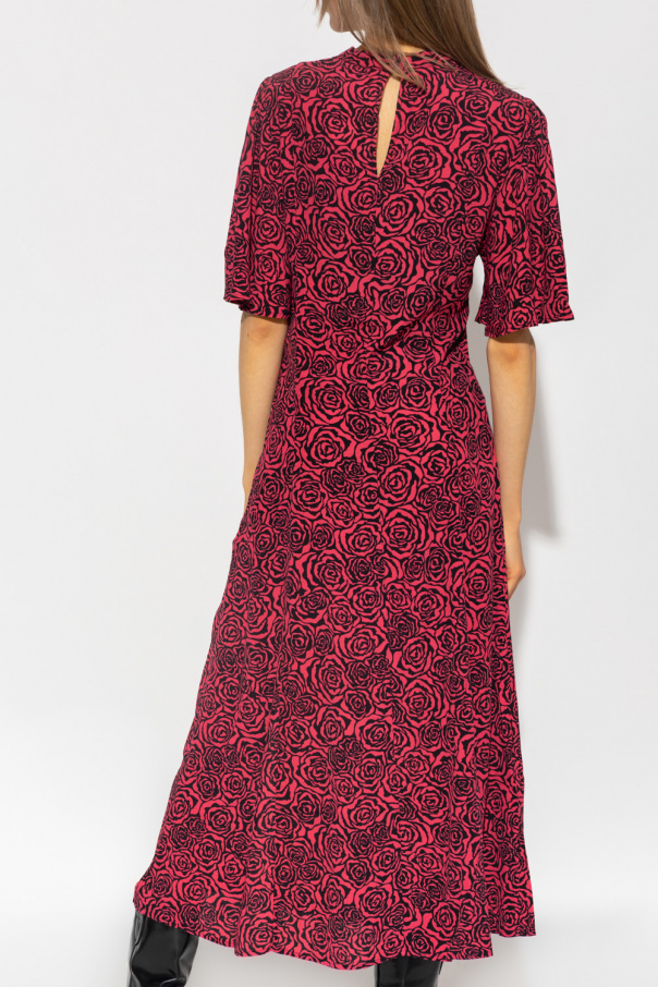 Red and black ‘RosyGZ’ dress from Gestuz. Decorated with a floral motif, this design features decorative draped details, square neck and short, puff sleeves.