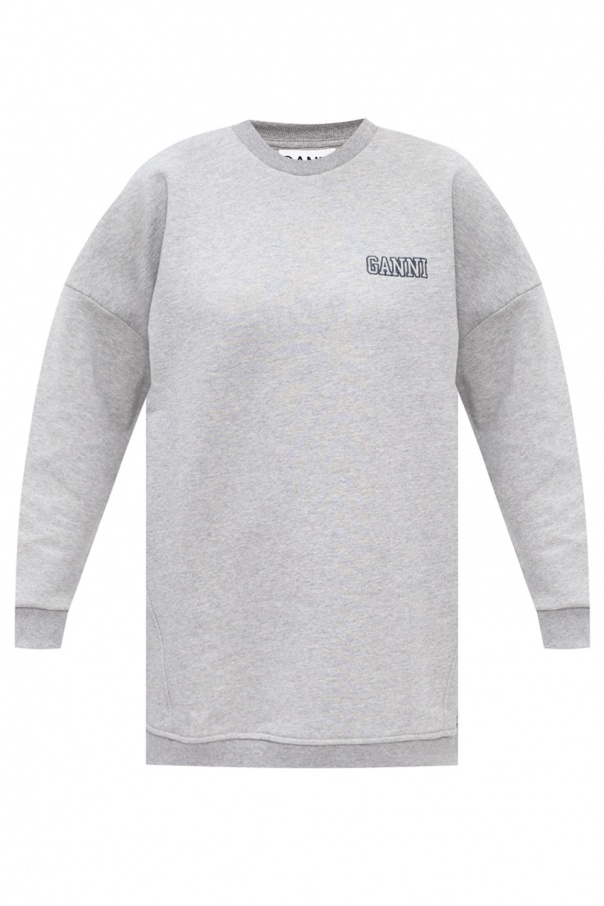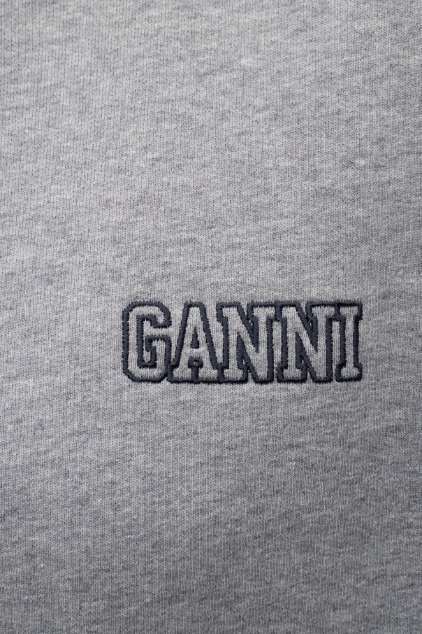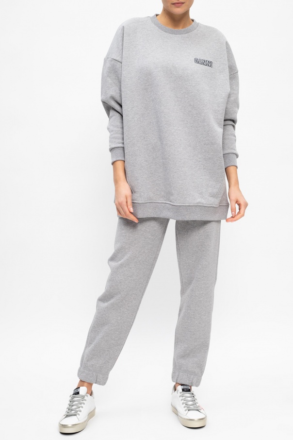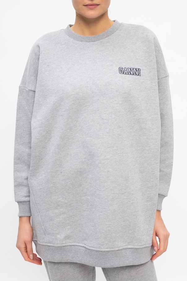 Grey crewneck sweatshirt from Ganni. Cut from cotton jersey fabric with an oversize silhouette, this style showcases an embroidered logo on the front and rib-knit trims at the bottom hem and cuffs.