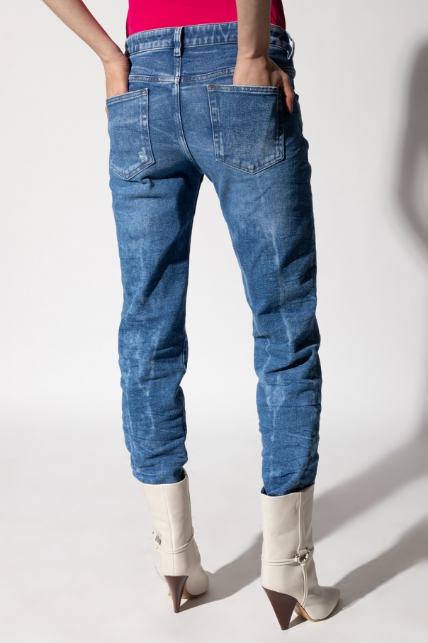 Blue ‘D-Rifty’ distressed jeans from Diesel. Fastened with a zip and button, this tapered leg design features orange stitching details, logo patch, red logo embroidery, three front pockets, two back pockets and raw cut edges.