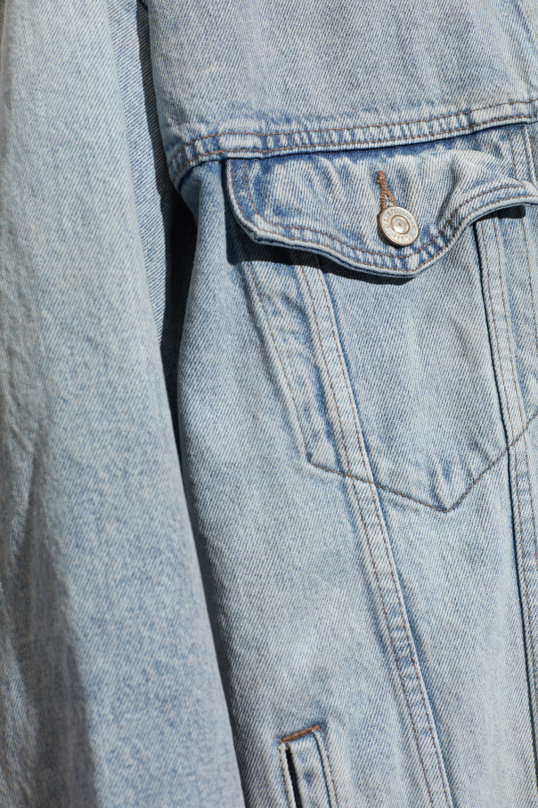 Light blue denim jacket from Balenciaga. Crafted with an oversize fit, this style showcases a graphic print with a size sticker. It is complete with button fastenings, two welt pockets, two flapped pockets with buttons and long sleeves with button cuffs.
