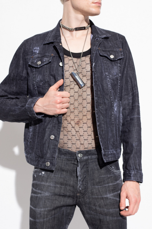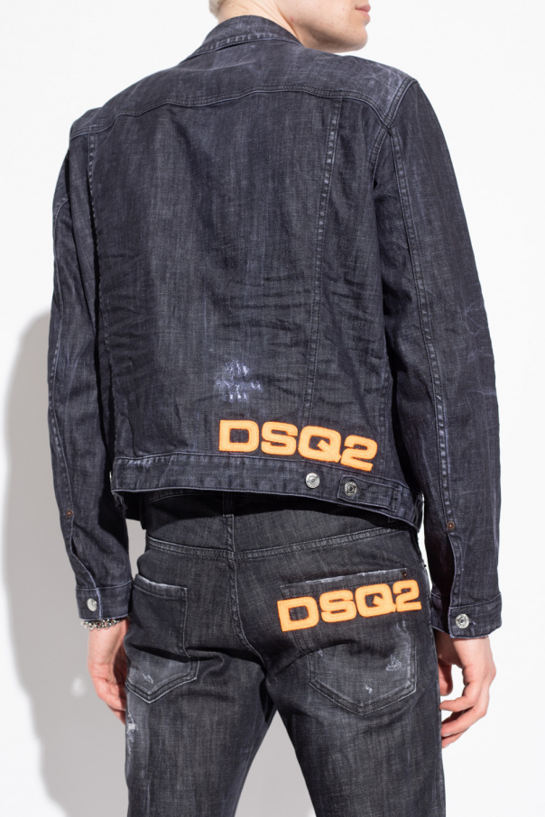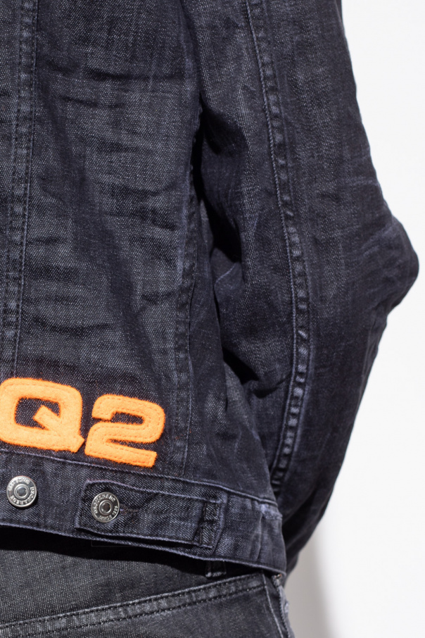Black distressed denim jacket from Dsquared2. Fastened with buttons, this garment features two slip pockets, two buttoned flap pockets, neon orange logo patch at the back and button cuffs.