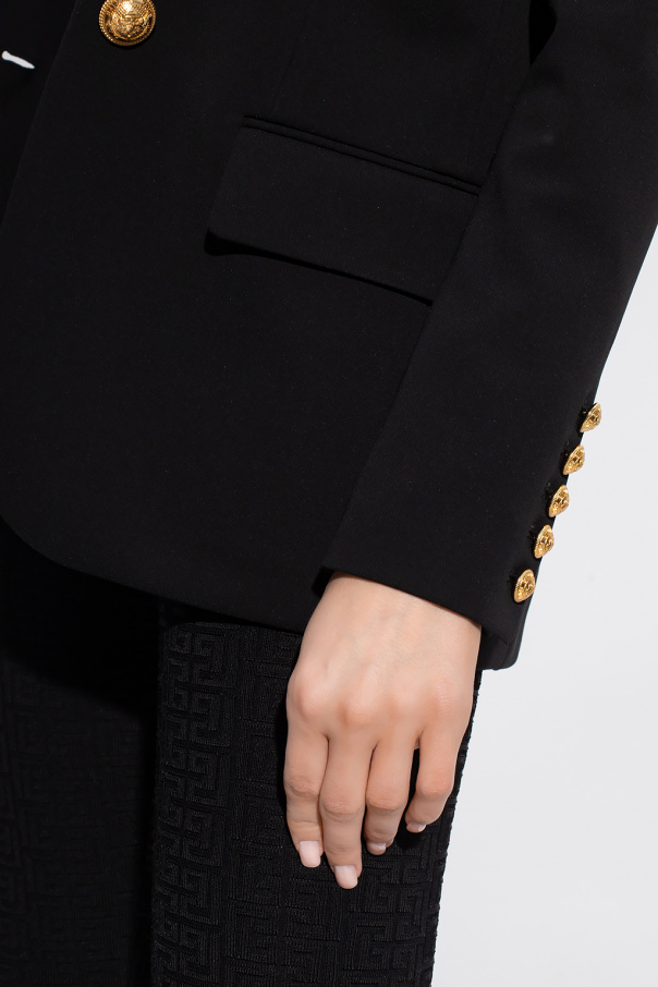 Black blazer with peak lapels from Balmain. Fastened with gold-tone logo-embossed buttons, this garment features two flap pockets, one slip pocket, long sleeves and a single rear vent.