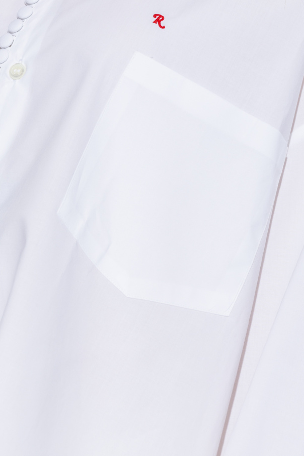 White shirt from Raf Simons. Made of cotton with an oversize silhouette, this style features button fastenings, an embroidered logo in red, a slip chest pocket, side bottom slits and long sleeves with button cuffs.