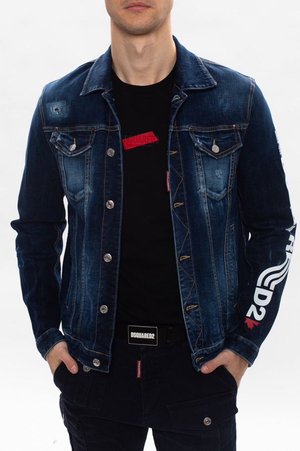 Navy denim jacket from Dsquared2. Fastened with buttons, this design features two slip pockets, two buttoned flap pockets, a worn effect, printed logo pattern in white and long sleeves with button cuffs.