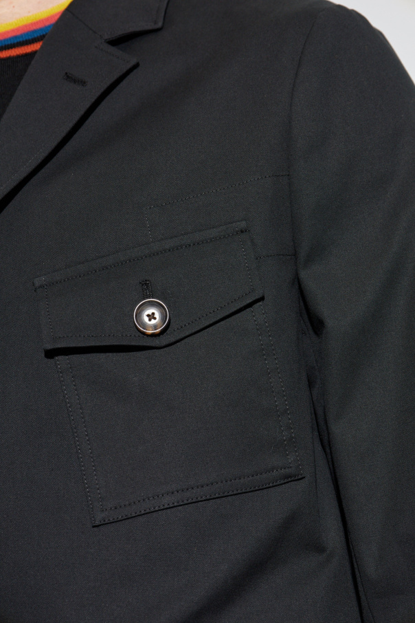 Introducing the Paul Smith Black Pocket Jacket, a paragon of sartorial excellence that seamlessly blends functionality with a timeless aesthetic. Crafted from a sumptuous blend of cotton and a hint of elastane, this jacket offers a sophisticated silhouette while ensuring comfort and flexibility. The jacket’s dominant black hue exudes elegance, making it a versatile addition to any discerning gentleman\'s wardrobe. Its classic cut, characterized by long sleeves and a distinctive round neckline, evokes a sense of refined style. The front closure is meticulously designed with a series of buttons, adding a touch of traditional charm. Noteworthy are the four flap pockets, each secured with a button that not only serves a practical purpose but also adds an element of decorative flair. A closer inspection reveals metal buttons on the upper pockets, each bearing a unique pattern or logo that signifies the distinguished Paul Smith brand, thereby enhancing the jacket’s exclusivity. The back of the jacket maintains a sleek and unadorned style, further emphasizing its elegant simplicity. Details such as buttoned sleeve cuffs and a subtle back slit underscore the jacket’s formal elegance while allowing for greater mobility. Why Purchase This Jacket? Elegantly tailored from high-quality materials, offering both style and durability. Classic design with modern details, including decorative buttoned pockets and a unique round neckline. Subtle branding elements that signify the luxurious Paul Smith identity. Versatile and sophisticated, perfect for a variety of occasions.