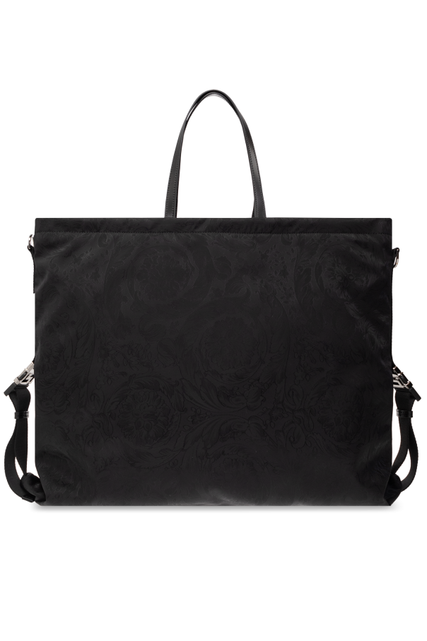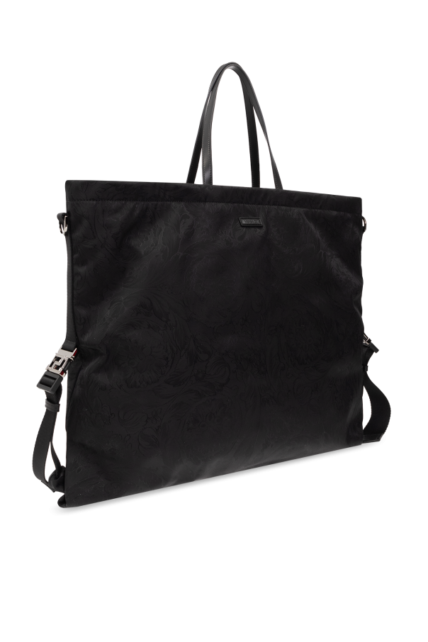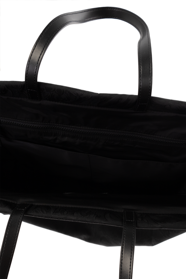 Black shopper bag from Versace. Made from a primary ECONYL® regenerated nylon material, this design showcases a jacquard ‘Barocco Silhouette’ pattern. It is complete with adjustable side tabs with the brand\'s signature Greca buckles, two half-round handles, silver-tone metal elements and one internal compartment with one zip pocket and two slip pockets.
