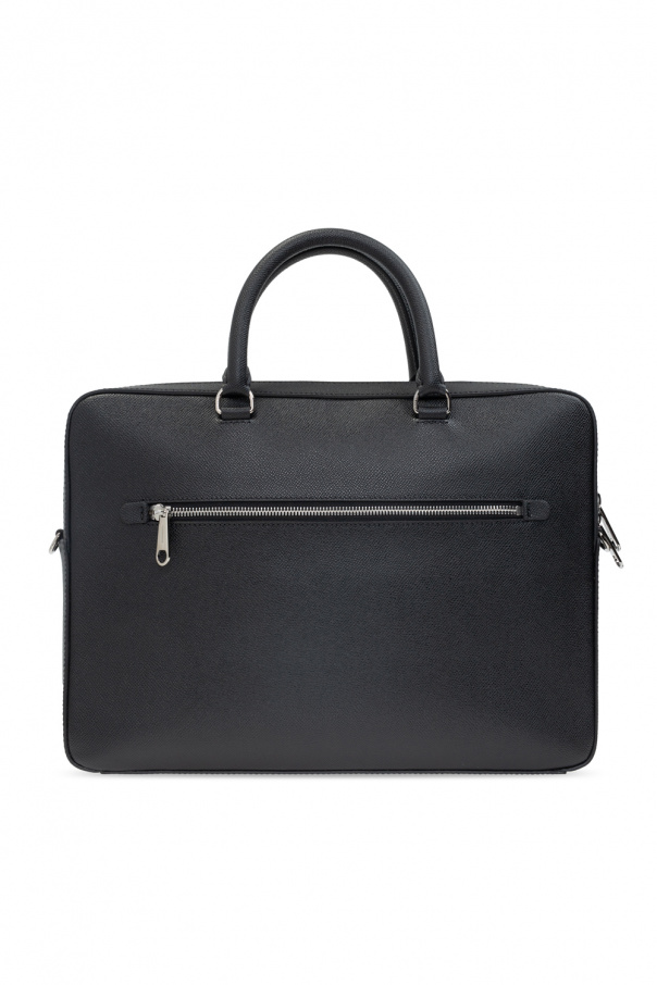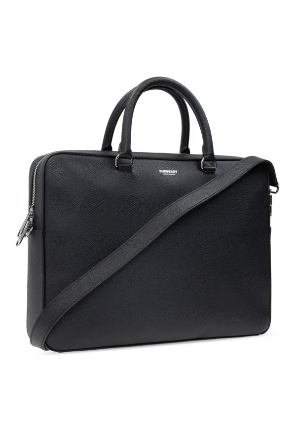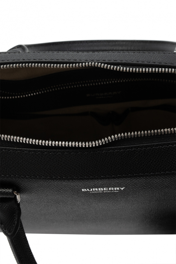 Black shoulder bag from Burberry. Crafted from calf leather, this design fastens via a two-way zip and showcases the brand\'s logo printed on the front. It is complete with a zip pocket at the back, two half-round handles, a detachable and adjustable shoulder strap, silver-tone metal hardware and one internal compartment with numerous pockets.