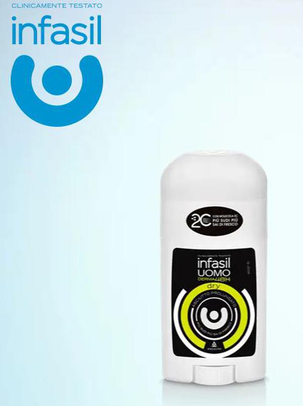 Длительное противовлажностное действие и исключительная защита от избыточного потоотделения: Infasil Uomo Derma 48H Dry, специально разработанный для мужчин, протестирован на чувствительной коже и дает очень стойкое ощущение сухости.
