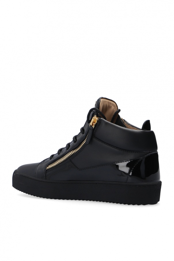 Black ‘May London’ boots from Giuseppe Zanotti. Crafted from leather, this lace-up pair is set on a black rubber sole and showcases extra zip closures and gold-tone metalware with logo for the brand recognition.