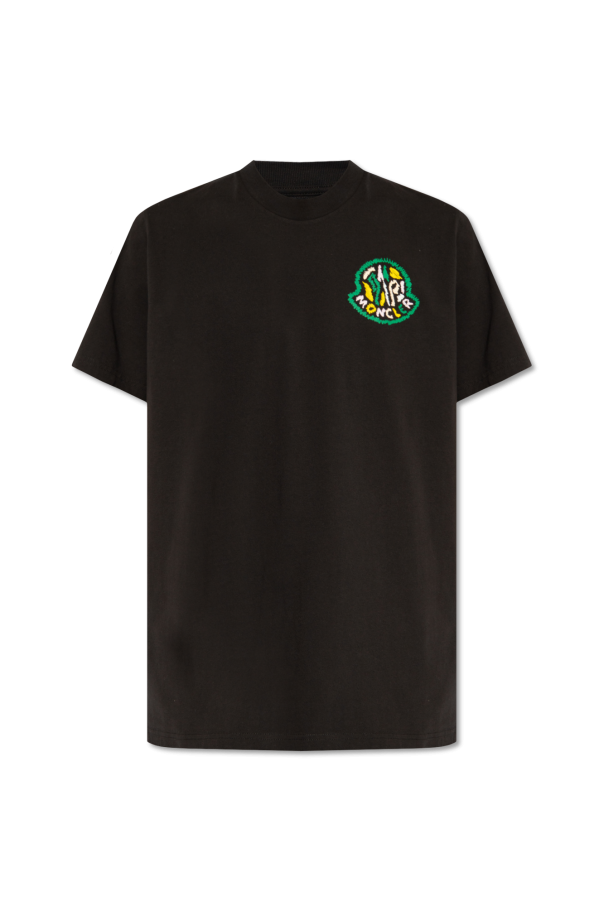 Black crewneck T-shirt from Moncler. Made of cotton, this style features a colourful graphic print with the brand\'s logo, ribbing on the collar and short sleeves – one has a monogrammed patch.