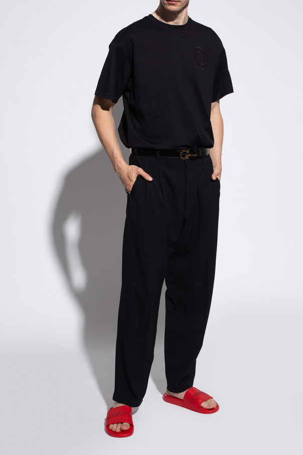 Red slides from Burberry. Set on a red rubber sole, this pair showcases an embossed logo.