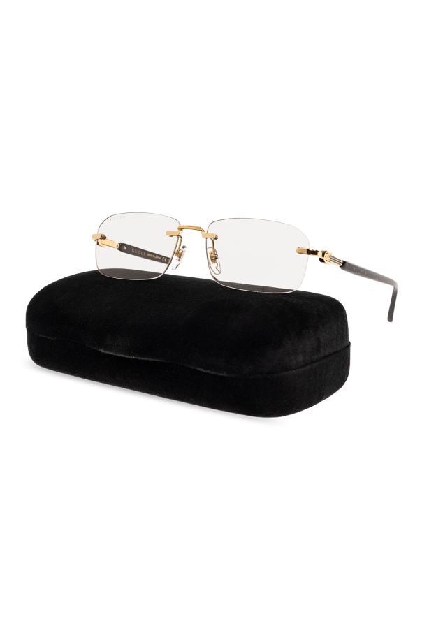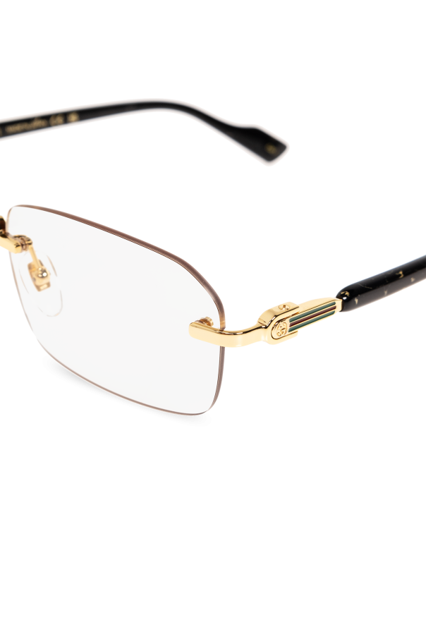 Gold-tone and black rectangular sunglasses from Gucci. This model showcases the brand\'s logo and green-red-green Web stripe on the temples and beige lenses with 100% UV protection (cat. 1). Comes with a case, whose colour is individually selected for each pair of glasses.