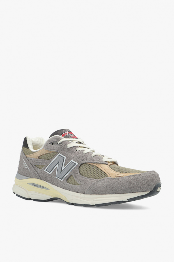 Grey, green and white ‘990 V3’ sneakers from New Balance. Crafted from mesh with pigskin and natural suede trims, this lace-up model has signature branding on the heel, tongue and sides, and rests on a ENCAP midsole for supreme cushioning and traction and rubber sole in white and cream.
