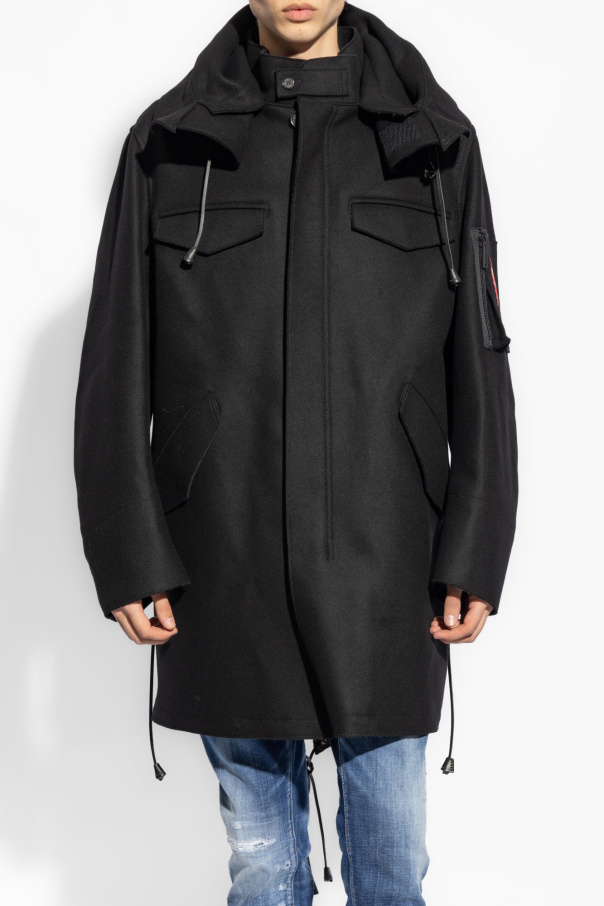 Immerse yourself in the epitome of winter elegance with the Dsquared2 Woolen Coat. Crafted from a luxurious blend of wool, polyamide, and a hint of elastane, this exquisite piece combines enduring warmth with a touch of stretch for unparalleled comfort. Presented in a timeless black hue, this coat is an exemplary showcase of fine craftsmanship and sartorial excellence. Designed for the discerning individual, the coat features a sophisticated round neckline and a long silhouette that gracefully extends below the hips, offering substantial protection against the colder elements. The inclusion of a generously sized, well-defined hood adds a layer of functionality, shielding you from wind and rain with effortless style. The front of the coat is adorned with two large chest pockets with flaps and two side inset pockets, providing ample space for essentials. A distinctive red emblem with the \"DSQ2\" inscription set against a maple leaf accents the sleeve, highlighting the designer\'s attention to detail and branding prowess. Further enhancing its practicality, the coat is equipped with a zip closure complemented by additional snap button fastenings, ensuring a secure and snug fit. Adjustable drawstrings at the hem and hood, along with Velcro straps at the cuffs, allow for a customized fit, catering to your comfort and styling preferences. The smooth, unembellished back panel rounds off the design, maintaining a sleek and polished aesthetic. Why Purchase This Coat? Exceptional warmth and comfort, thanks to the high-quality wool blend. Functional design with a luxurious hood, multiple pockets, and adjustable features for a perfect fit. Iconic Dsquared2 branding, signifying exclusivity and designer appeal. Versatile and timeless style, suitable for a variety of occasions.