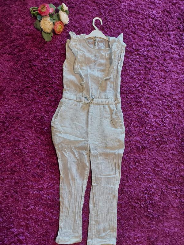 Просто великолепный легкий,летний, брючный комбинезон для вашей принцессы Monor Kids в отличном состоянии, раз одели. Комбинезон из облегченного хлопка, хлопок настолько тонкий что светится, на фото постаралась показать напротив света. На груди и сзади украшен вертикальными рюшами до пояса, а также маталической позолоченной тонкой нитью. Сзади на пуговичках. По бокам врезные карманы. На поясе бантик. Просто незаменимая вещь для летних прогулок, невесомый. Замеры отправлю по запросу. На бирке указан размер 110, подойдет на 5-6лет, думаю можно и раньше.