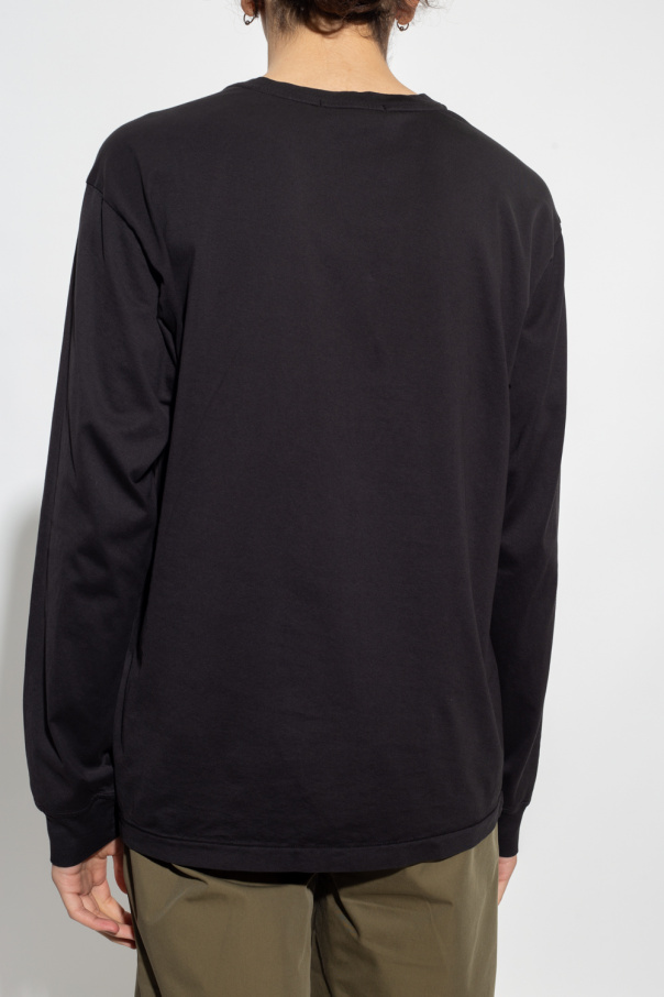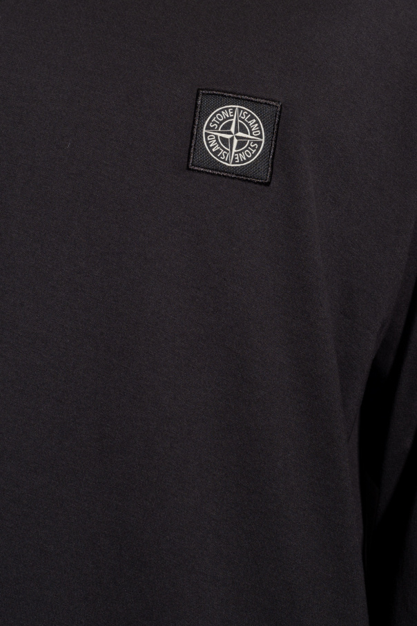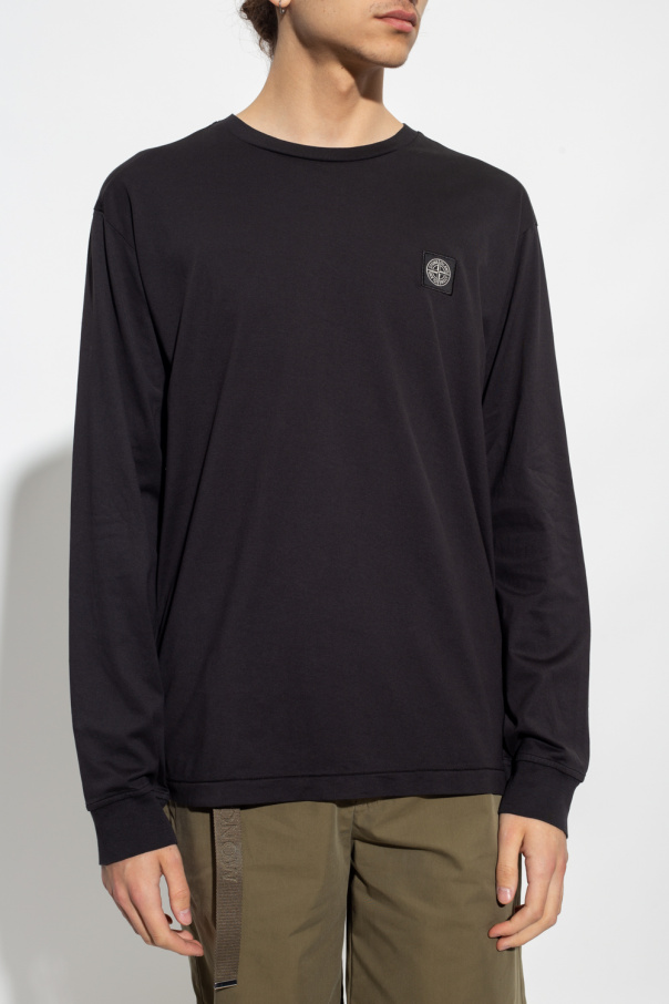 Black crewneck T-shirt with long sleeves from Stone Island. Made of cotton, this style features an elasticated collar and cuffs and a white logo patch for brand recognition.