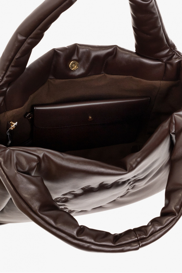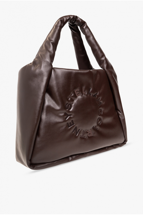 Dark brown shopper bag from Stella McCartney. Crafted from faux leather, this design features a magnetic snap fastening, an embroidered logo on the front, two half-round straps and one internal compartment with a removable pouch with a snap closure.