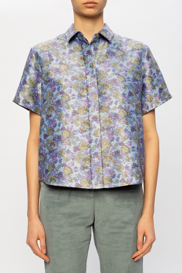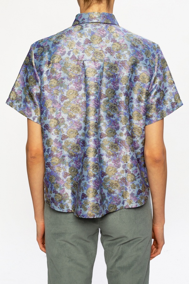Blue shirt from Samsoe Samsoe. Illustrated with floral jacquard pattern all over, this short-sleeved item fastens via buttons with a concealed placket.
