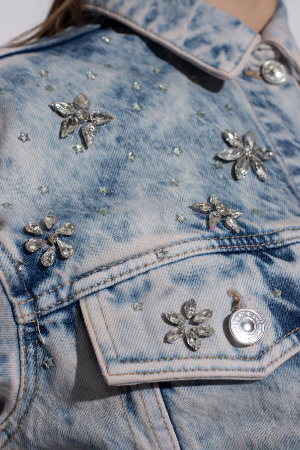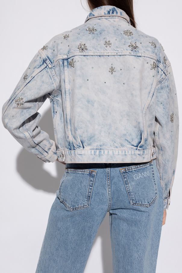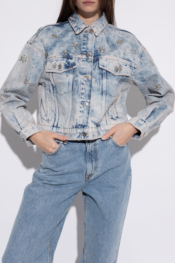 Blue ‘Monty’ denim jacket from AllSaints. Fastened with buttons, this garment features decorative appliqués, two buttoned flap pockets, two slip pockets and long sleeves with button cuffs.