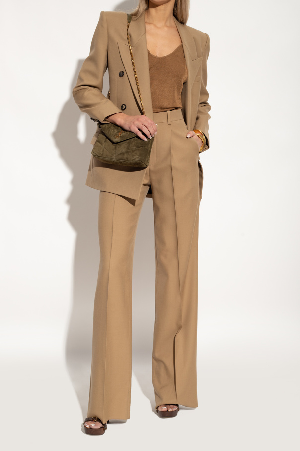 Dark brown ‘Joan’ platform sandals from Saint Laurent. Made of calf leather, this pair features an adjustable buckled ankle strap, antique gold-tone studs and wood sole with rubber trimming.
