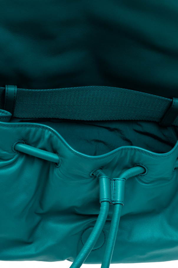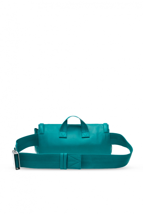 Green \'Beak\' belt bag from Bottega Veneta. Crafted from leather with fabric trims, this design features magnetic and drawstring fastenings, an adjustable belt, pocket fastened with a two-way zip and one internal compartment.